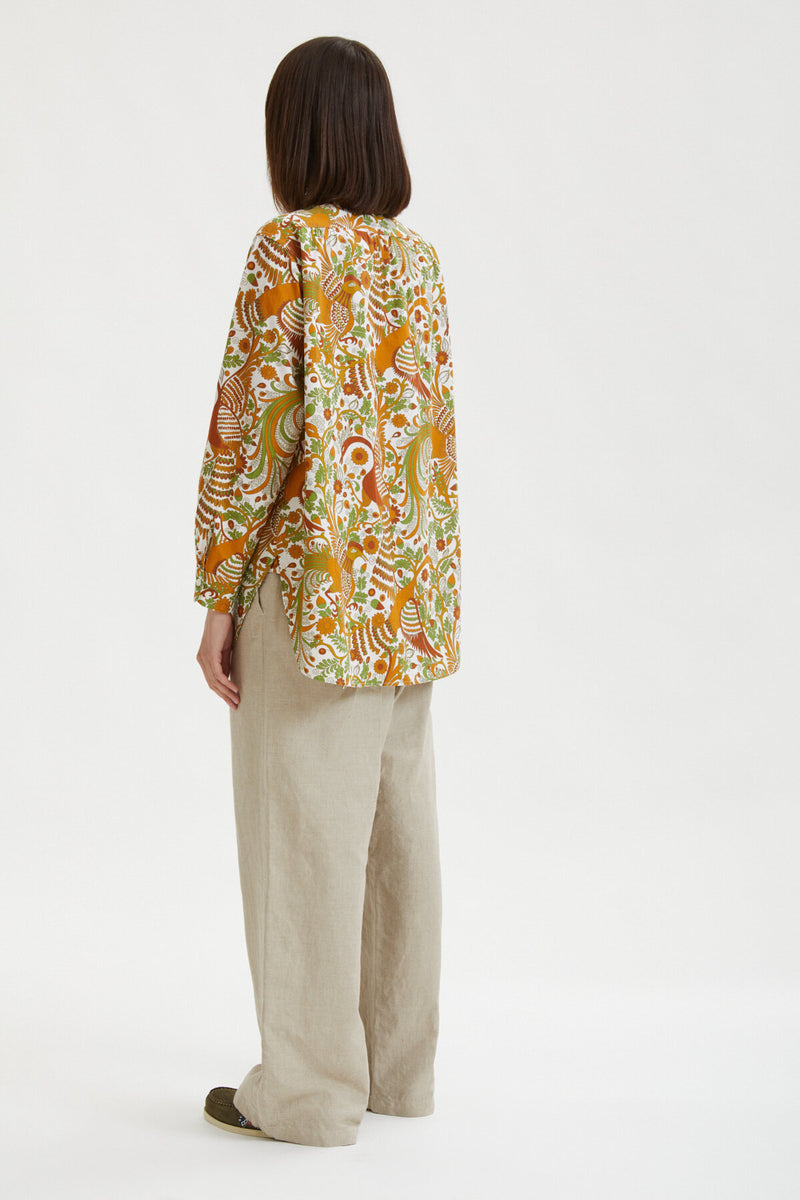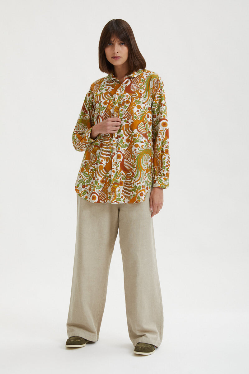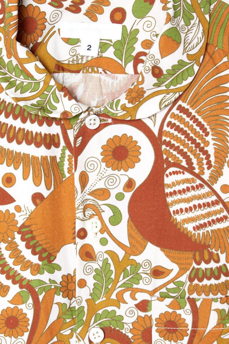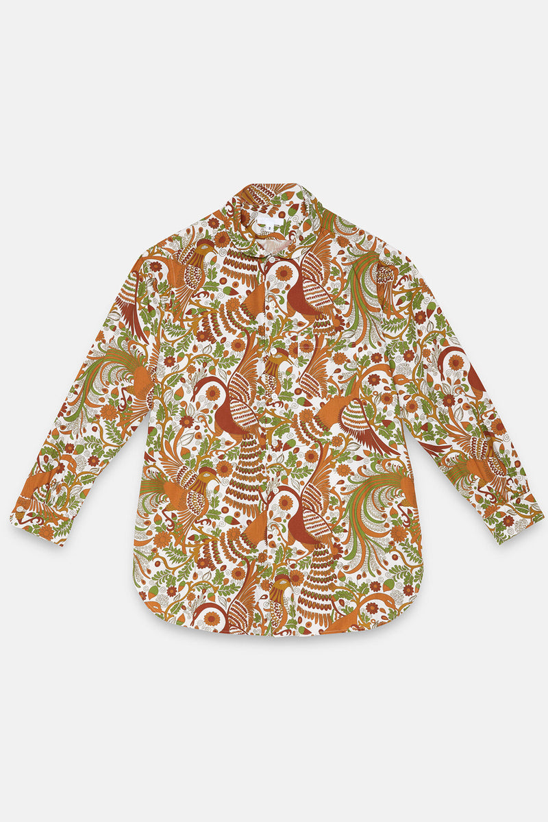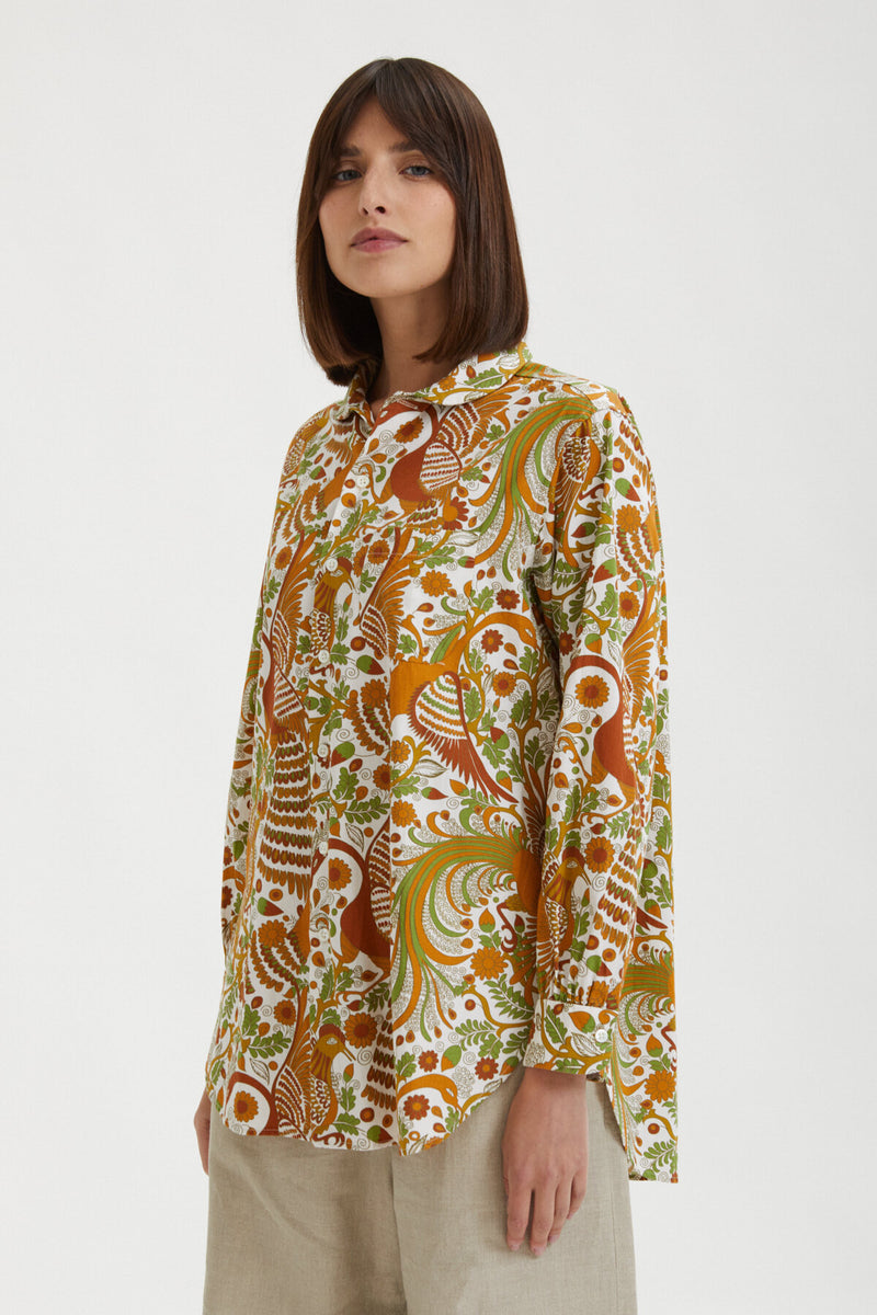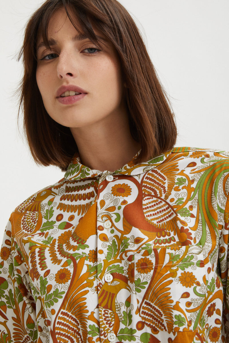 Questa camicia con collo arrotondato presenta un vivace motivo a pavone declinato in tonalità calde, un’abbottonatura frontale, polsini con bottoni che donano maggiore definizione alle maniche e un taschino frontale.